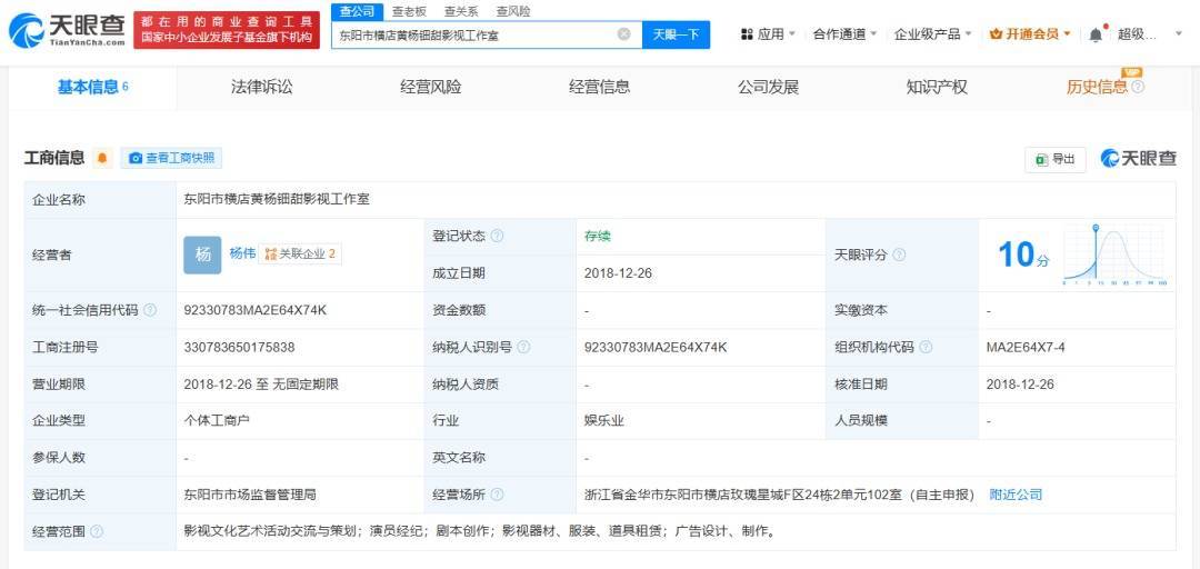 东阳市横店黄杨钿甜影视工作室则成立于2018年12月,杨伟为经营者。值得注意的是,杨伟于近日卸任深圳市水瓷慕美妆贸易有限公司(曾用名:益善堂(深圳)生物科技有限公司)法定代表人、执行董事、总经理并退出股东行列。该公司成立于2020年4月,注册资本1000万人民币。