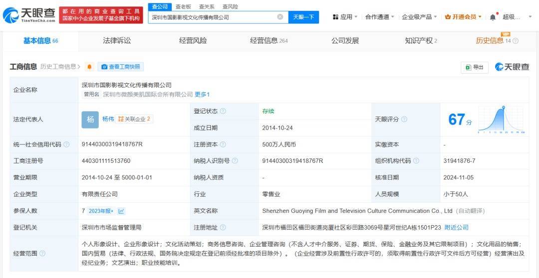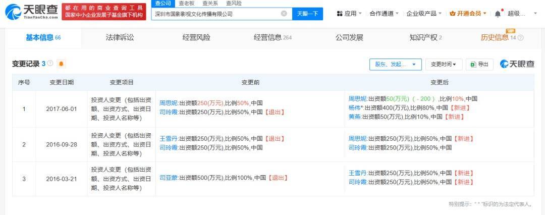 天眼查商业履历信息显示,黄杨钿甜父亲杨伟除近日退出的深圳市水瓷慕美妆贸易有限公司外,还关联深圳市国影影视文化传播有限公司、东阳市横店黄杨钿甜影视工作室。其中,深圳市国影影视文化传播有限公司成立于2014年10月,注册资本500万人民币,由杨伟担任法定代表人、总经理、执行董事并持股80%。今年4月25日,该公司发布减资公告,注册资本将由500万人民币减至2万人民币。变更记录显示,杨伟于2017年6月入股该公司并任职。