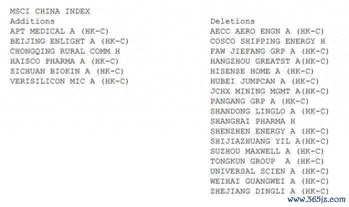 此外,MSCI中国指数本次还剔除海信家电(000921.SZ)、一汽解放(000800.SZ)、上海医药(02607)、金诚信(603979.SH)等17只股票。
